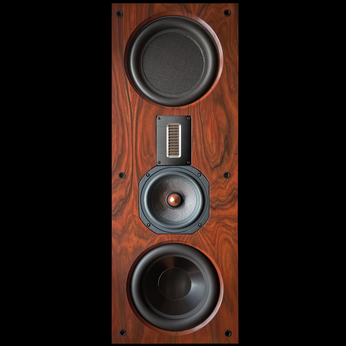 The slim depth is achieved through careful driver selection and enclosure engineering. A 4-inch AMT folded ribbon tweeter, Legacy's signature high-frequency driver, pairs with a 7-inch graphene-filled carbon fiber midwoofer and a 10-inch woofer. A 10-inch mass-loaded passive radiator extends the bass response below the woofer's natural roll-off, producing usable output down to 42Hz without the depth that a ported enclosure would require.